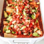 Top finished enchiladas with pico de gallo, fresh chopped cilantro, and avocado before serving!