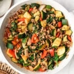This quick ground turkey skillet is a healthy dinner made with zucchini, bell pepper, and spinach. You'll love this one pot meal for busy weeknights or meal prep!