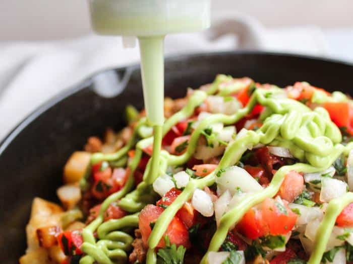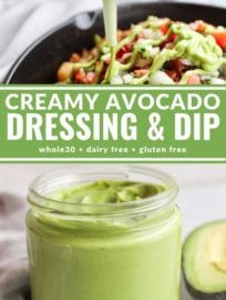 My all time favorite use for this Creamy Avocado Dressing & Dip is in tacos and burrito bowls. It’s so good! Add a big dollop to omelets. Dip your kabobs or raw veggies in it. Spread it on your sandwich. Slather it on your burger.