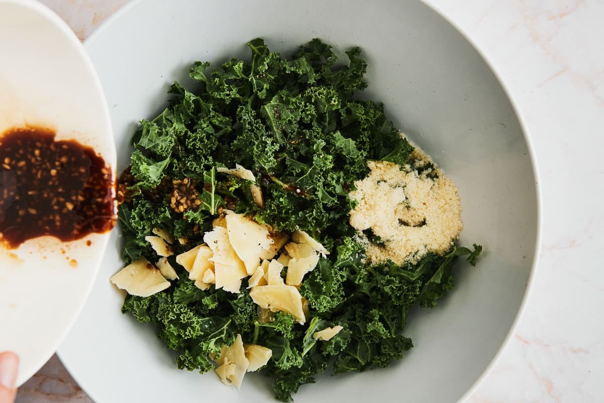 - Grated parmesan: We’re using two types of parmesan here to ensure we get plenty of parmesan flavor in the salad. The grated parmesan has a fine texture so it coats the kale leaves beautifully.
