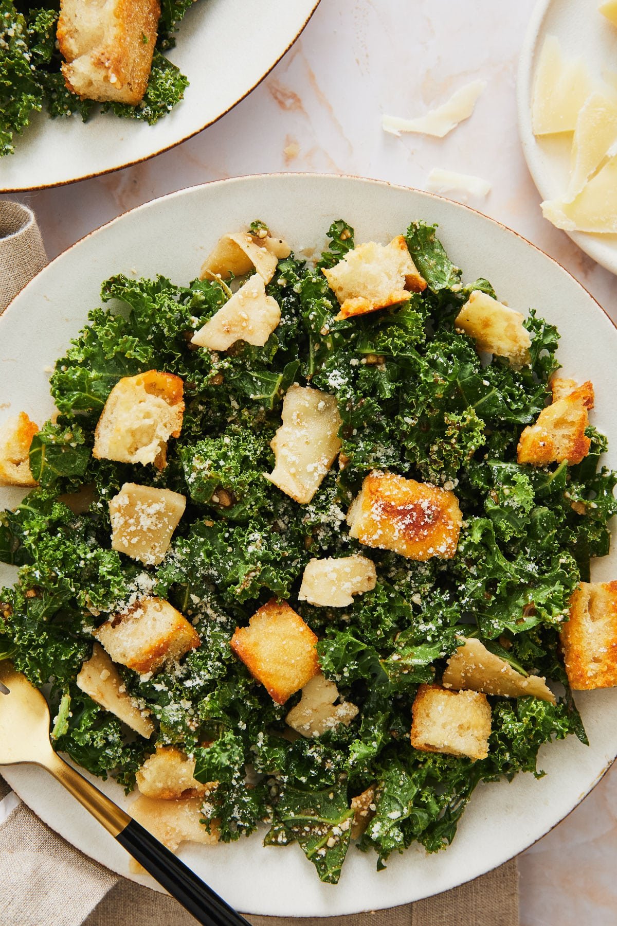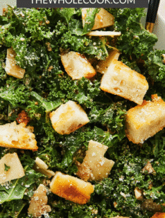 The star of this salad is the croutons and a generous portion of parmesan. What better way to get in a serving of kale than with crunchy bread and shaved parmesan, right?