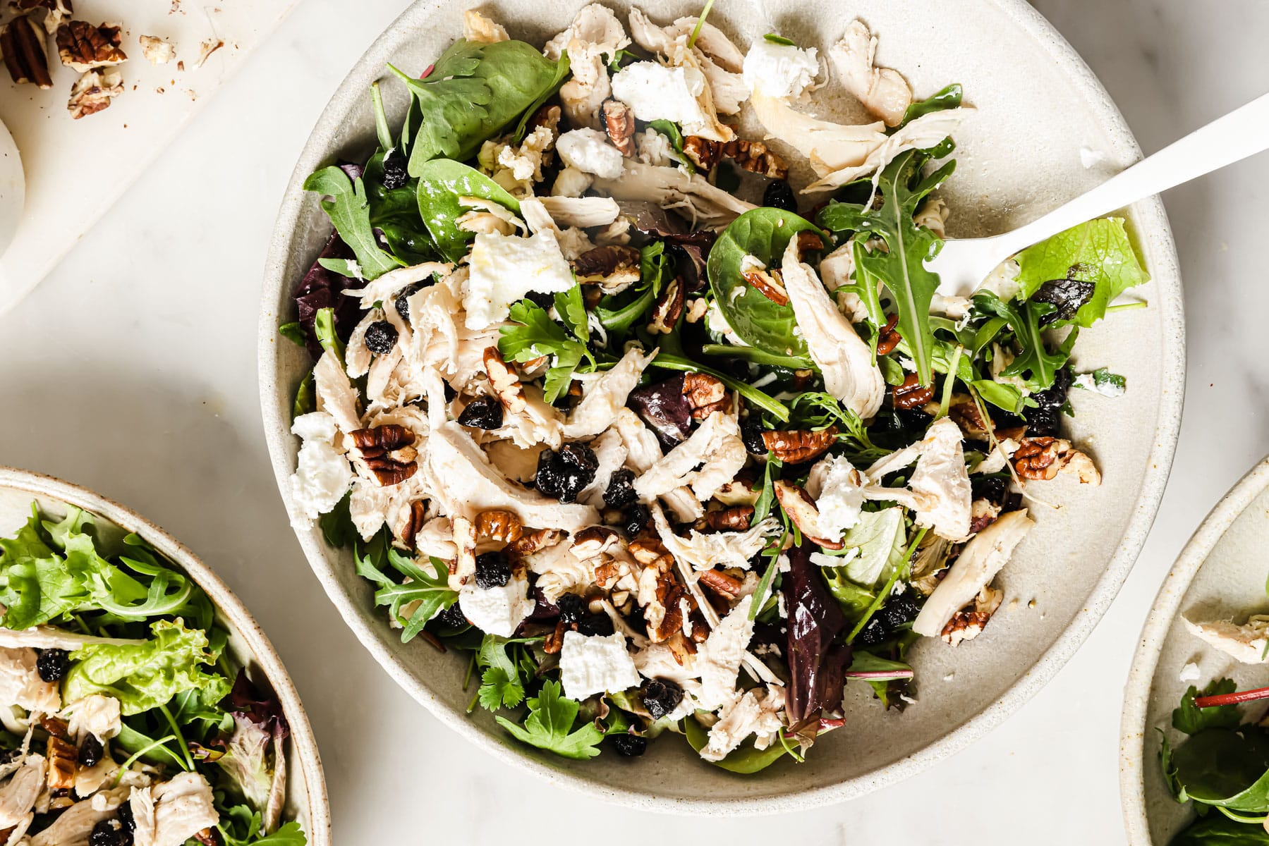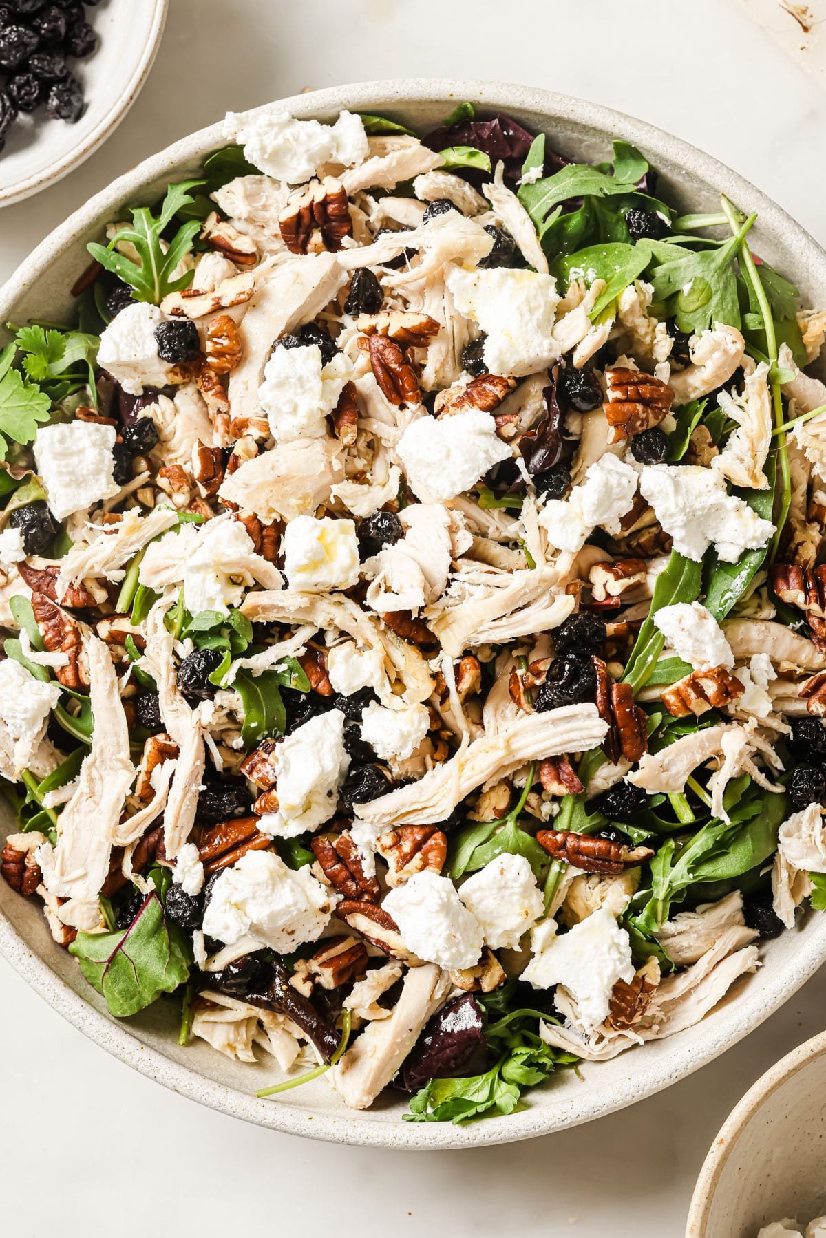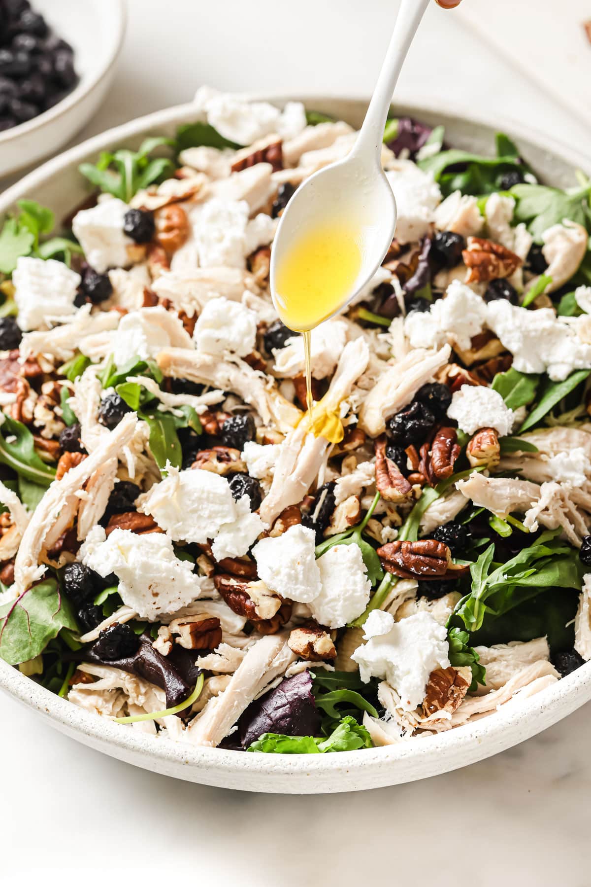 - Top the spring mix with cooked shredded or chopped chicken, chopped pecans, dried blueberries, and crumbled goat cheese.