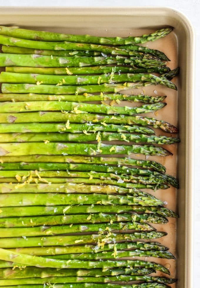 To make this recipe youโll trim the ends of your asparagus. Then spread the asparagus on a baking sheet. Drizzle with extra-virgin olive oil and lemon juice. Season with salt. Pop it in the oven until asparagus is tender crisp. Add extra lemon juice or lemon zest before serving if you like!
