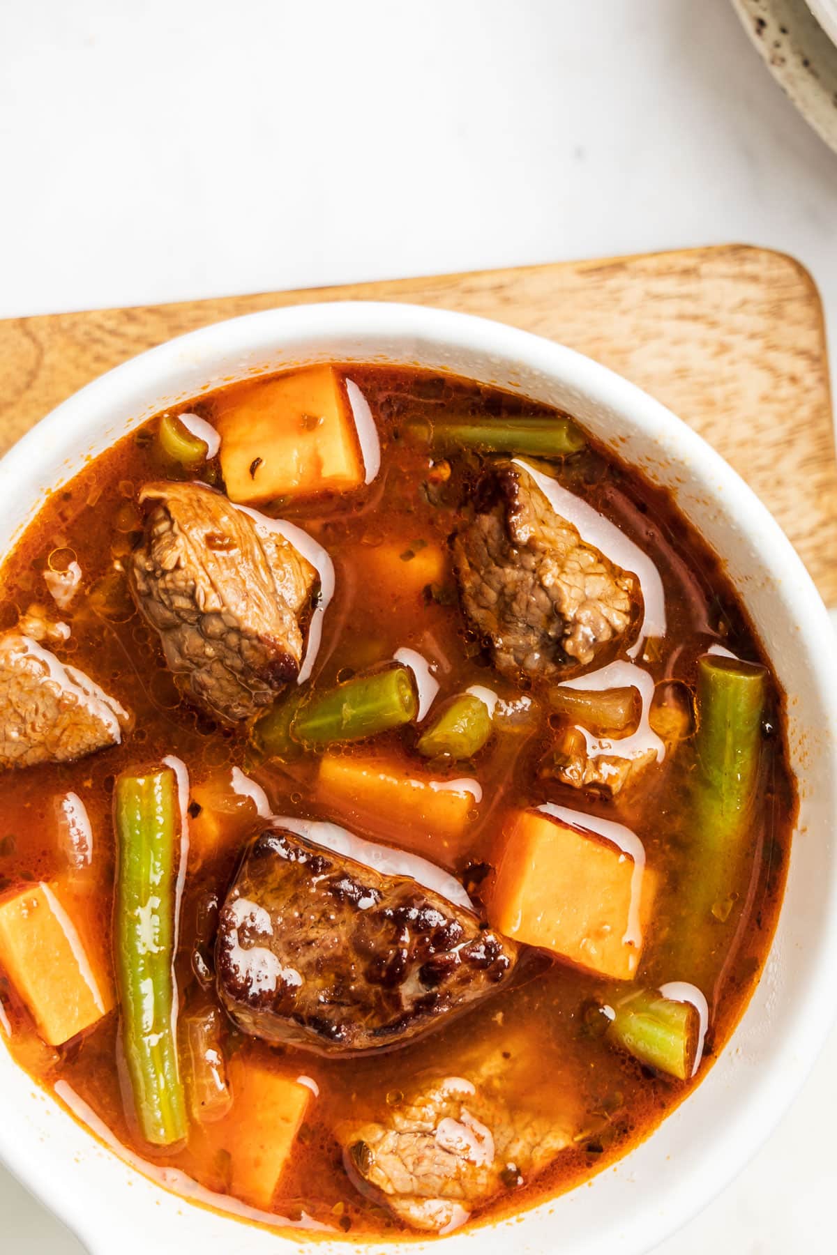 I was missing tomato paste so I left out two cups of broth and used a jar of basil & garlic spaghetti sauce and it turned out awesome. Wonderful flavor, and I added the rest of the ingredients but went with broccoli and cauliflower instead of green beans due to personal preference. Plus WOW those sweet potatoes go so well with the beef and other flavors a regular spud just would leave me feeling cheated.