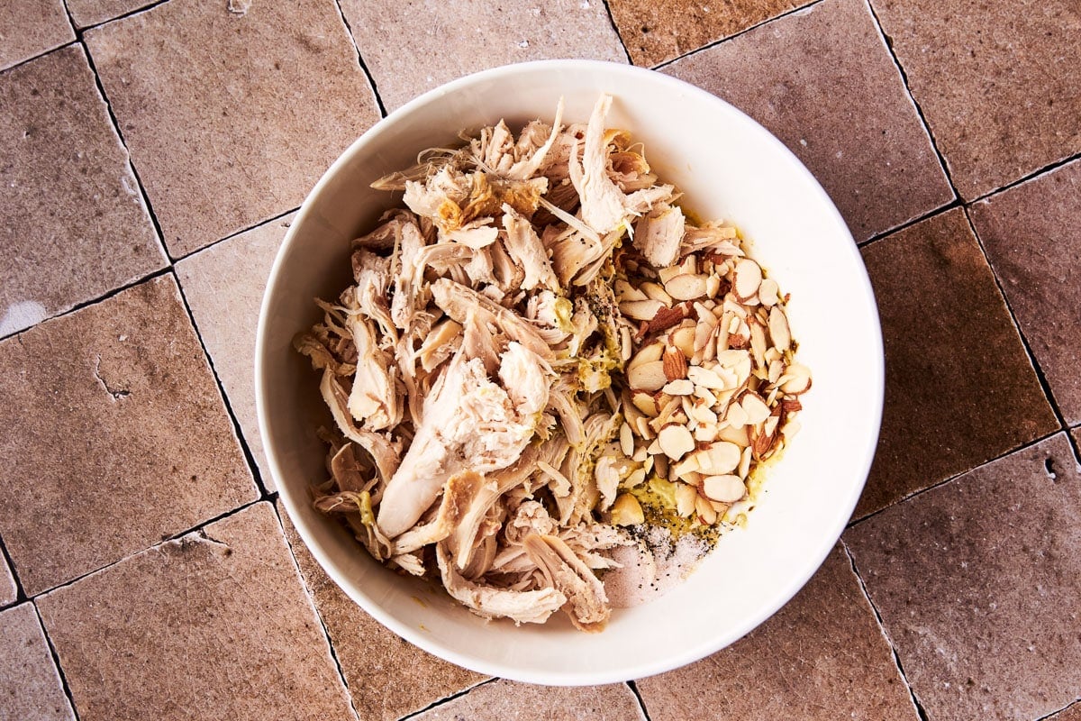 - Then stir in (to the same bowl) the shredded fully cooked chicken and sliced almonds. Taste and add as much salt and pepper as desired.