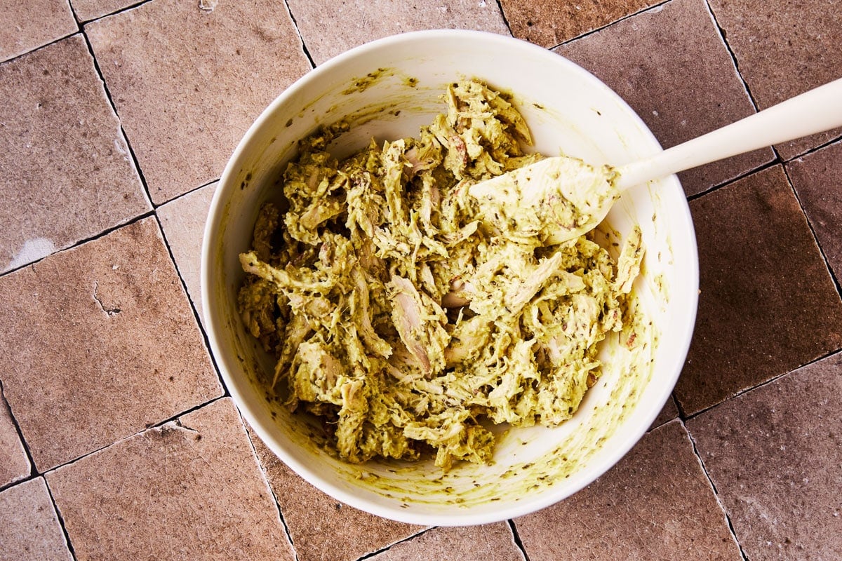 To make this easy pesto chicken salad recipe, start by stirring together the mayo and pesto in a large bowl (we’ll use the same bowl for the other ingredients).