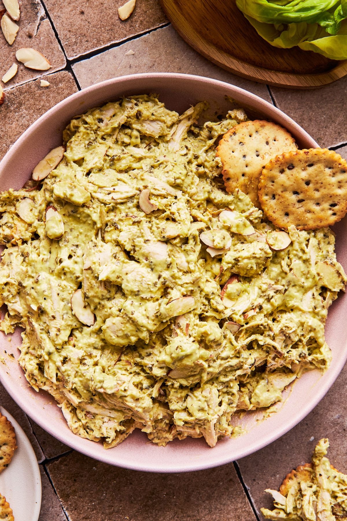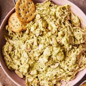 I’m a big fan of chicken salad. This creamy pesto chicken salad is a new favorite and so flavorful! It includes pesto for an extra fun punch of flavor. Feel free to use any store-bought pesto or use my recipe for Pistachio Lemon Pesto if you’d prefer to make your own pesto.