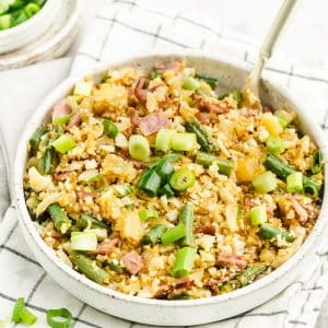 This fun twist on a low carb fried rice is made with cauliflower! It packs a punch of sweetness thanks to pineapple, includes the crunch of a few veggies, and delivers all the deliciousness of bacon. You’ll love this tasty side!