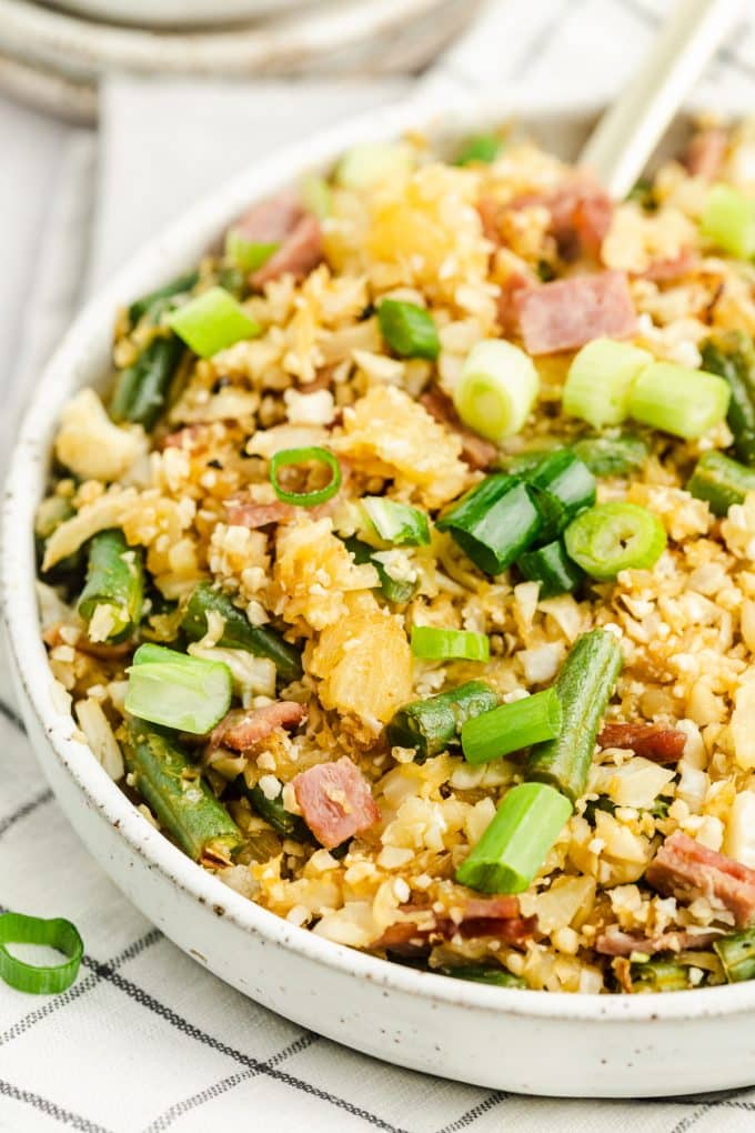 While it gives those fried rice vibes, this dish is actually mostly vegetables! Cauliflower, green beans, and green onion make up the bulk of this side.