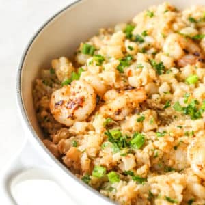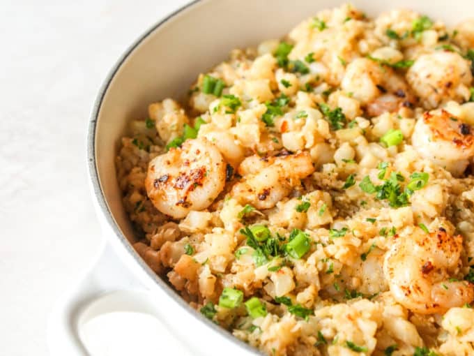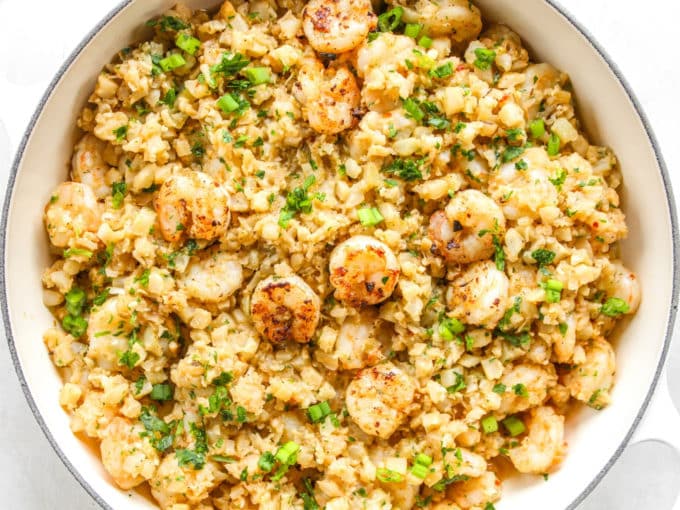This low carb one pot dish includes spicy seasoned shrimp and cauliflower rice. It’s incredibly flavorful and ready in under 20 minutes!