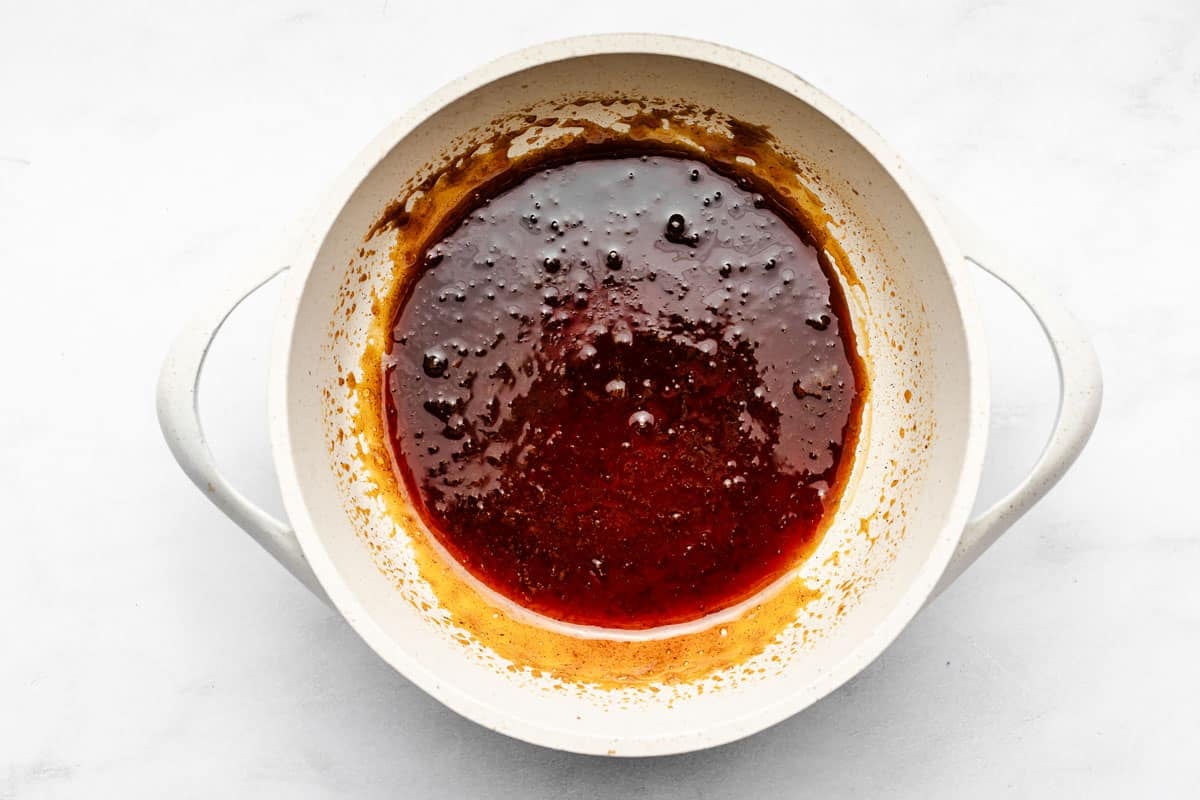 Combine all sauce ingredients in a small pot or sauce pan. Bring to a boil. Then drop the heat to medium-low. You should continue to see bubbles but they won’t look like they’re about to pour out of the pot. Simmer for 5 to 10 minutes or until sauce has thickened. When it coats the back of a spoon you know it’s ready. Let your sauce cool for a minute or two before adding to the chicken. It will continue to thicken as it sits.