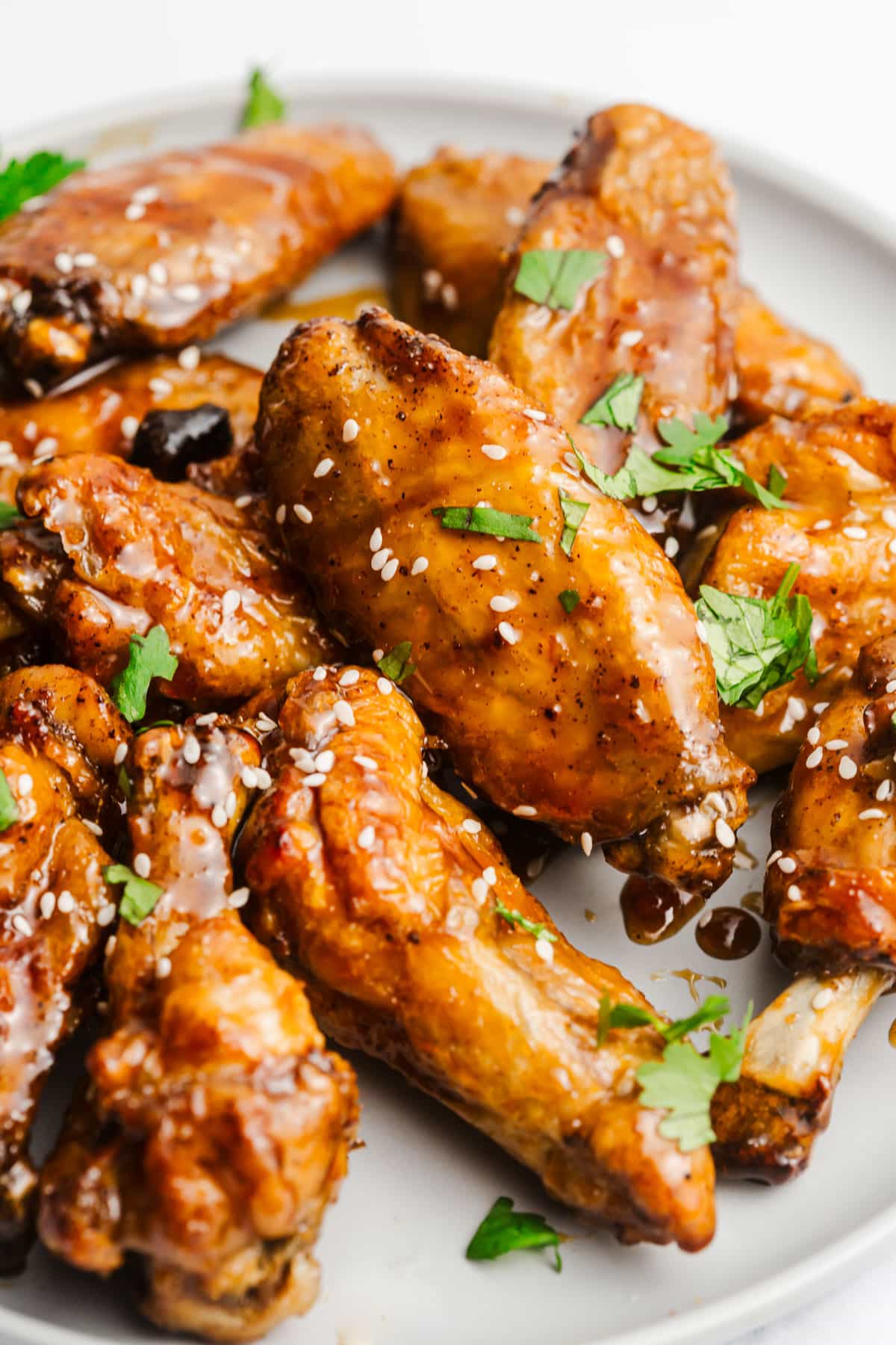 Add the baked chicken wings to a large bowl and toss in the sticky sauce to evenly coat. Top the coated wings with sesame seeds or fresh herbs (both are optional) if you’re entertaining and want to make these delicious chicken wings look extra special.