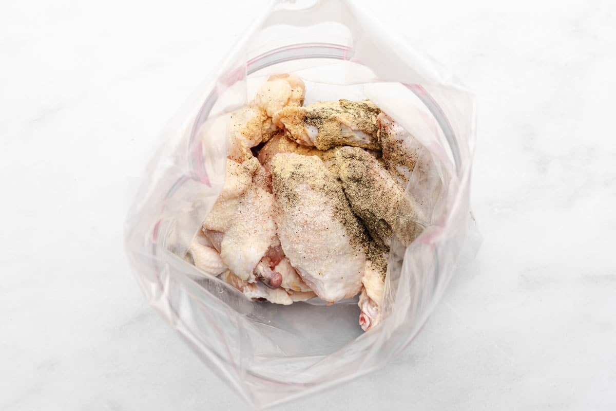 - Toss chicken in a large ziplock bag or sealed container with salt, pepper, and garlic powder. Shake so each wing is fully covered with the seasonings.