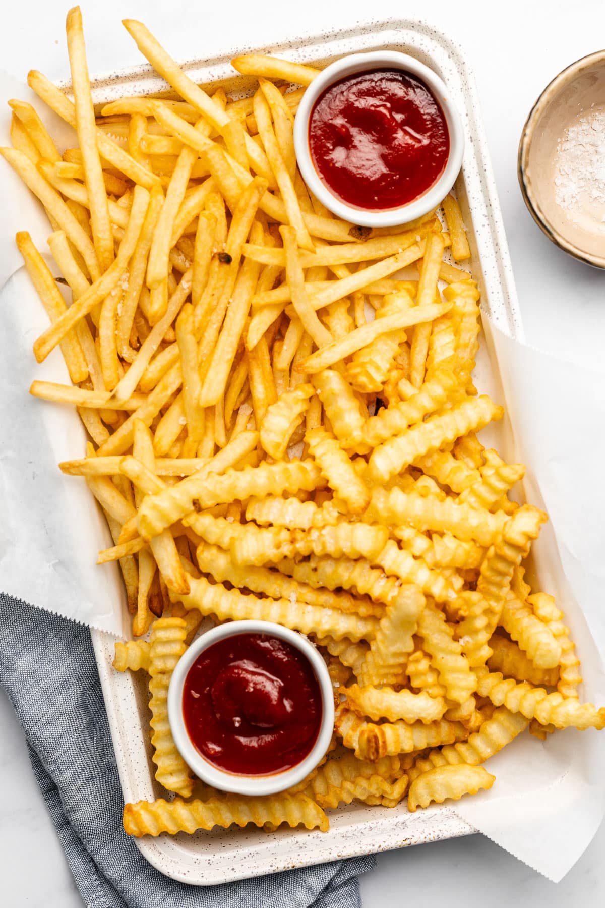 - Salt: Obviously a little salt is a must for french fries. You can also use other seasonings like black pepper, chili powder, paprika, garlic powder, onion powder, and/or italian seasoning to really amp up the flavor. Those are totally optional but fun ways to customize fries.