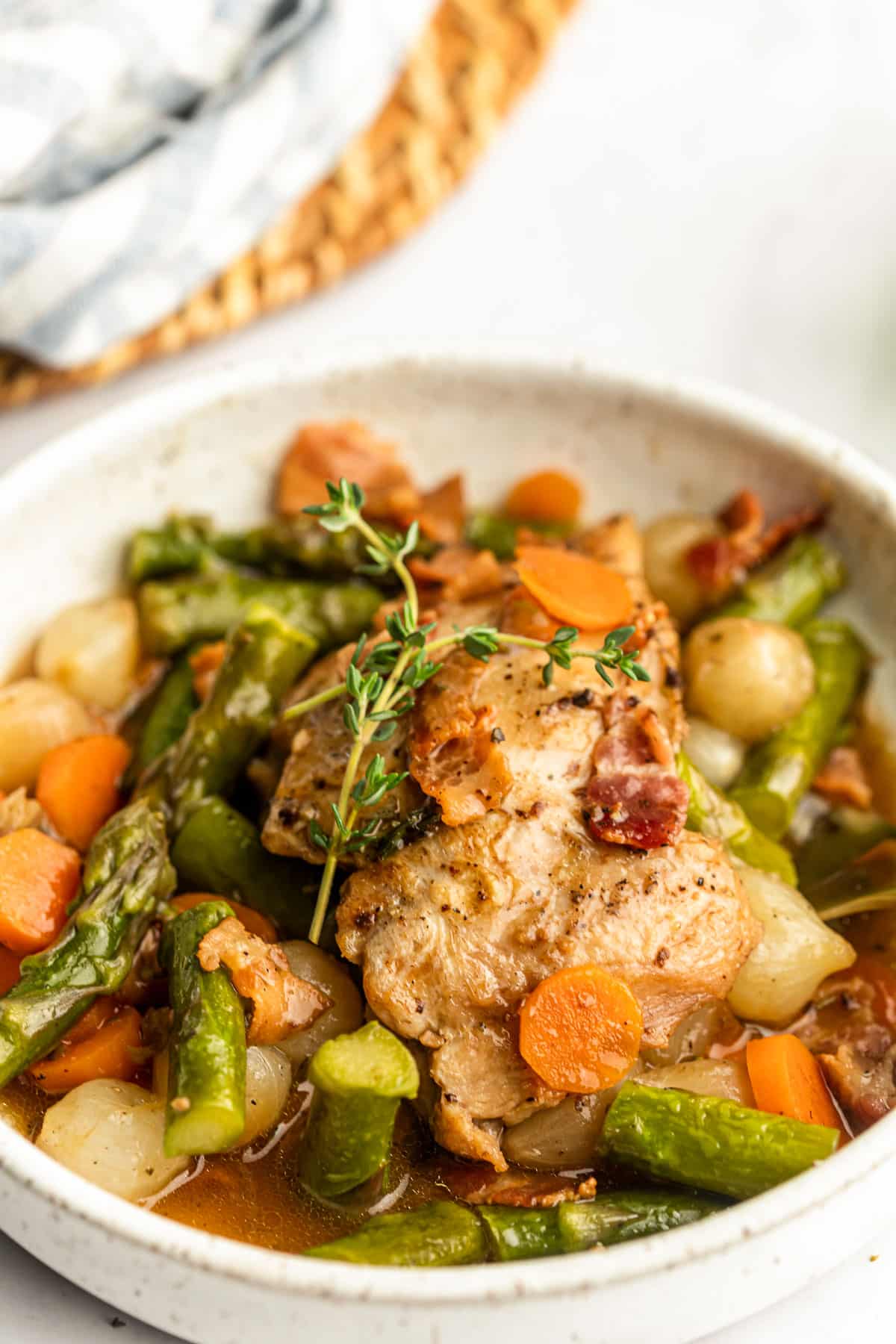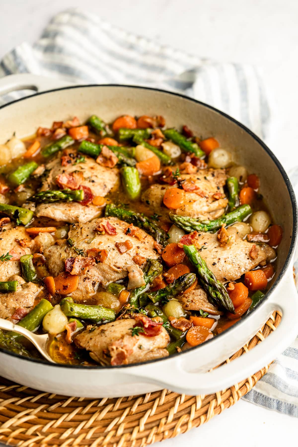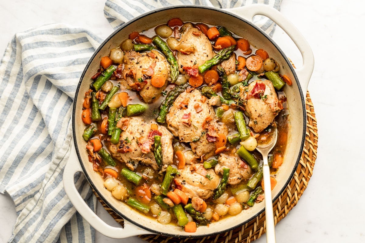 These chicken thighs achieve golden brown perfection before simmering in a savory sauce of chicken stock, balsamic vinegar, garlic, and bacon. Carrots and asparagus complete this dish to give you that veggie boost we are always looking for at dinnertime.