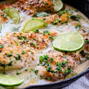 This Coconut Lime Chicken is a quick entree that earns rave reviews! The light and creamy sauce includes a bright burst of lime flavor you’re going to love.