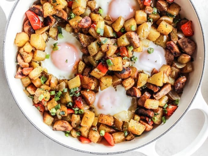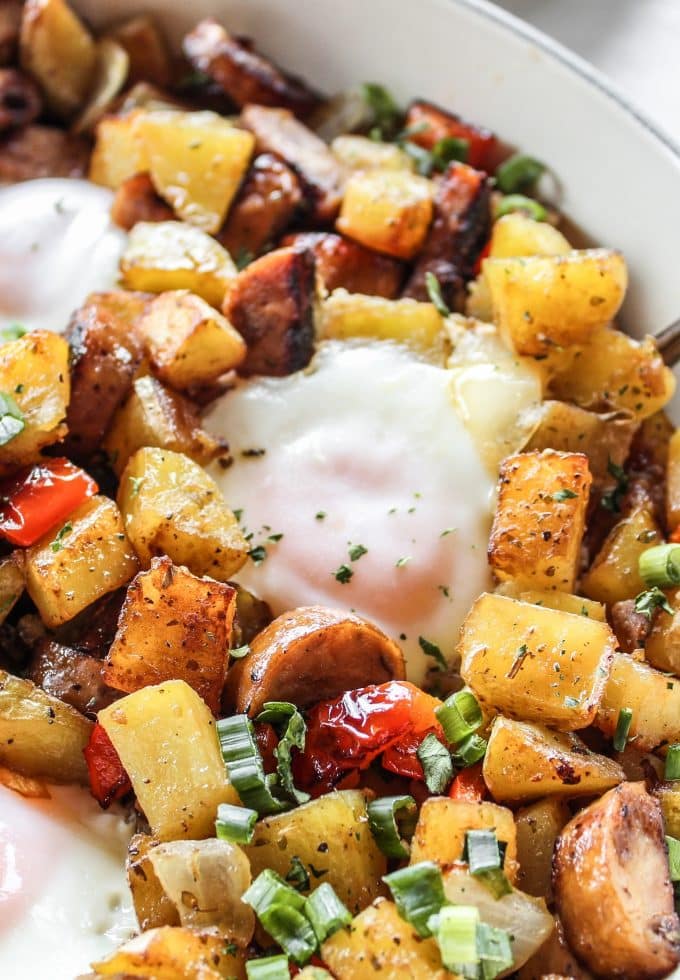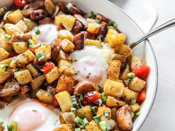I truly make skillet potatoes several times a week. I love them so. My favorite way to enjoy them is in a hash and this Chicken Sausage & Pepper Hash has been my preferred vehicle for those potatoes. Gah, this is so good, friend!