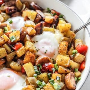 This Chicken Sausage & Pepper Hash is a hearty meal that you can easily whip up in about 25 minutes! Perfectly crispy and tender potatoes, chicken sausage, bell pepper, and eggs. Enjoy for breakfast, brunch, or dinner!