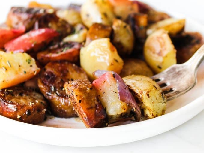 Drizzle with olive oil and all the seasonings. Use a spatula to spread everything around so that it’s evenly coated. Spread in a single layer on the baking sheet. Bake until potatoes are perfectly tender and enjoy!