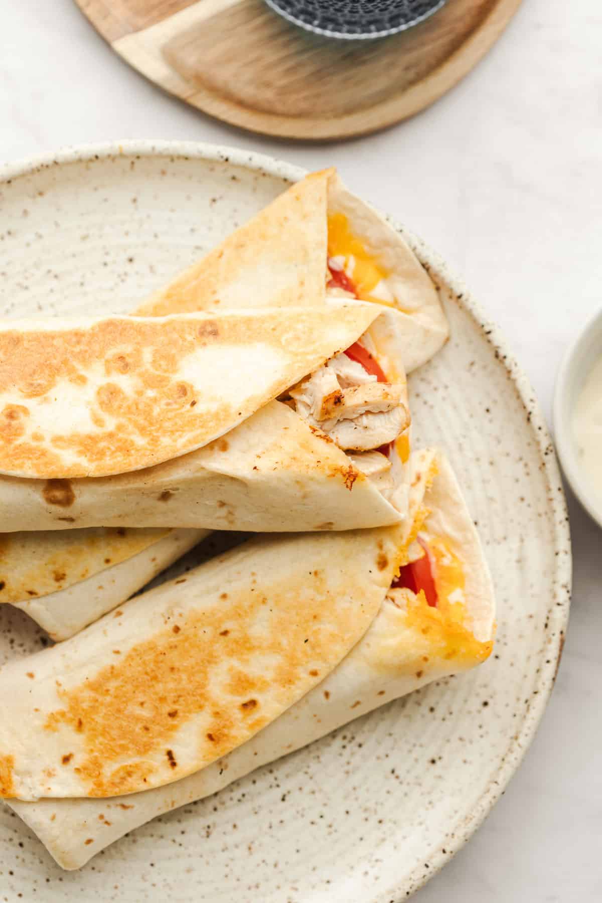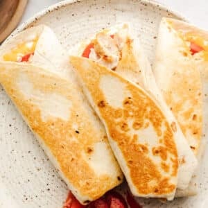 - To grill the tortillas: You should have some oil remaining in the skillet. If not, add more or use a cooking spray on the outside of the wraps so we can get them beautifully browned. Add the wraps seam side down to the same skillet you used to cook your chicken. Press down on them as they cook. Cook on medium heat for about 3 to 4 minutes, flipping once, until the wrap is a golden brown and cheese is melted. Serve immediately. If using for meal prep, wrap each wrap in aluminum foil or store in an airtight container and keep in the refrigerator until ready to serve.