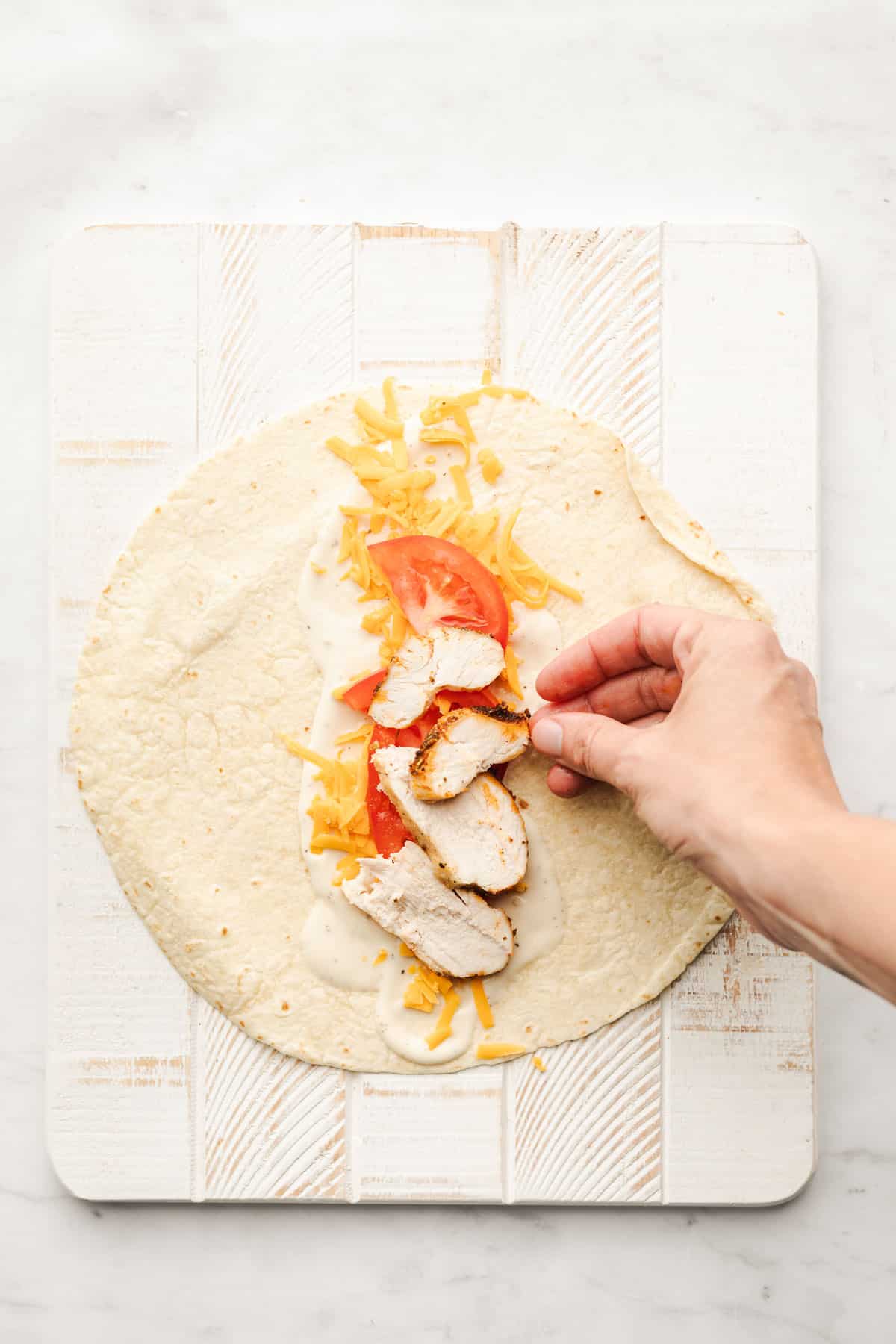 - Spread the flour tortillas onto a cutting board or baking sheet. Divide the ranch dressing and spread down the center of each tortilla. Divide the shredded cheddar down the center of each tortilla. Top with the sliced tomatoes and then with the cooked sliced chicken.