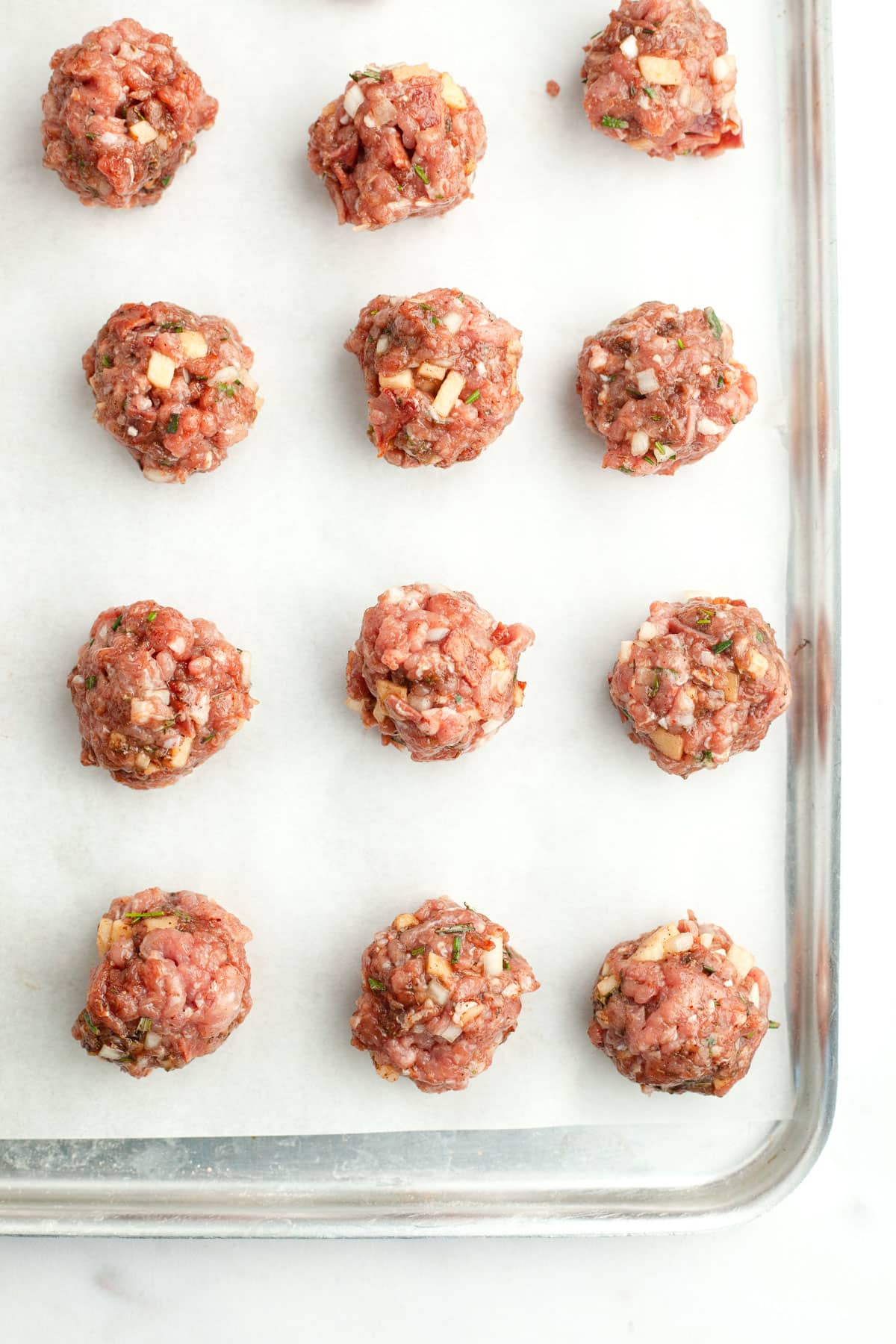 - Place meatballs in a single layer on a parchment paper lined baking sheet. (Can omit the parchment paper and use a greased baking sheet if you prefer.) Leave a little space in between each meatball.