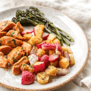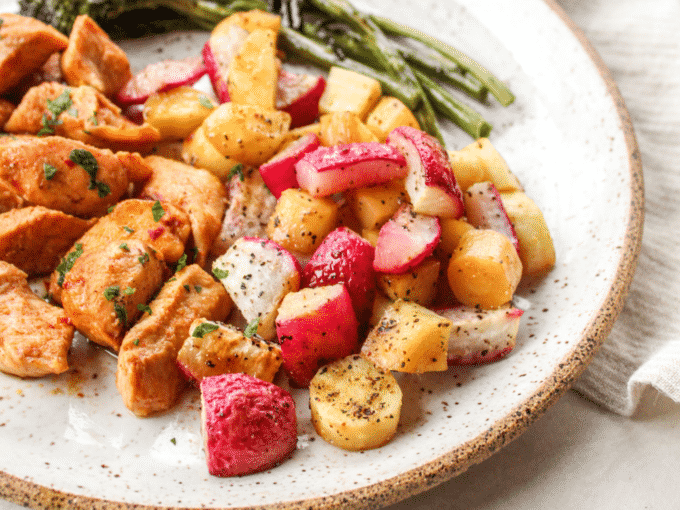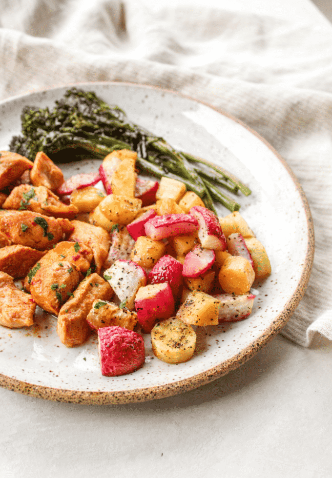 I wanted to try this dish because as mentioned in the recipe, parsnips and radishes are underrated. Obviously thatโs true because I never tried them until this recipe (besides radishes in salad). UUUMMM YUM! This dish was so good, and the chicken had amazing flavor. I wish I cut my parsnips a little smaller so theyโd be softer. I will definitely be making this recipe again.ย