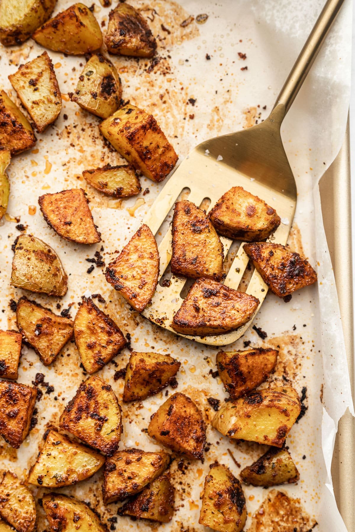 - Your potatoes must be spread in a single layer. If they’re piled on top of each other the ones on the top won’t get crispy. This makes it especially important to use a large enough pan to accommodate everything!