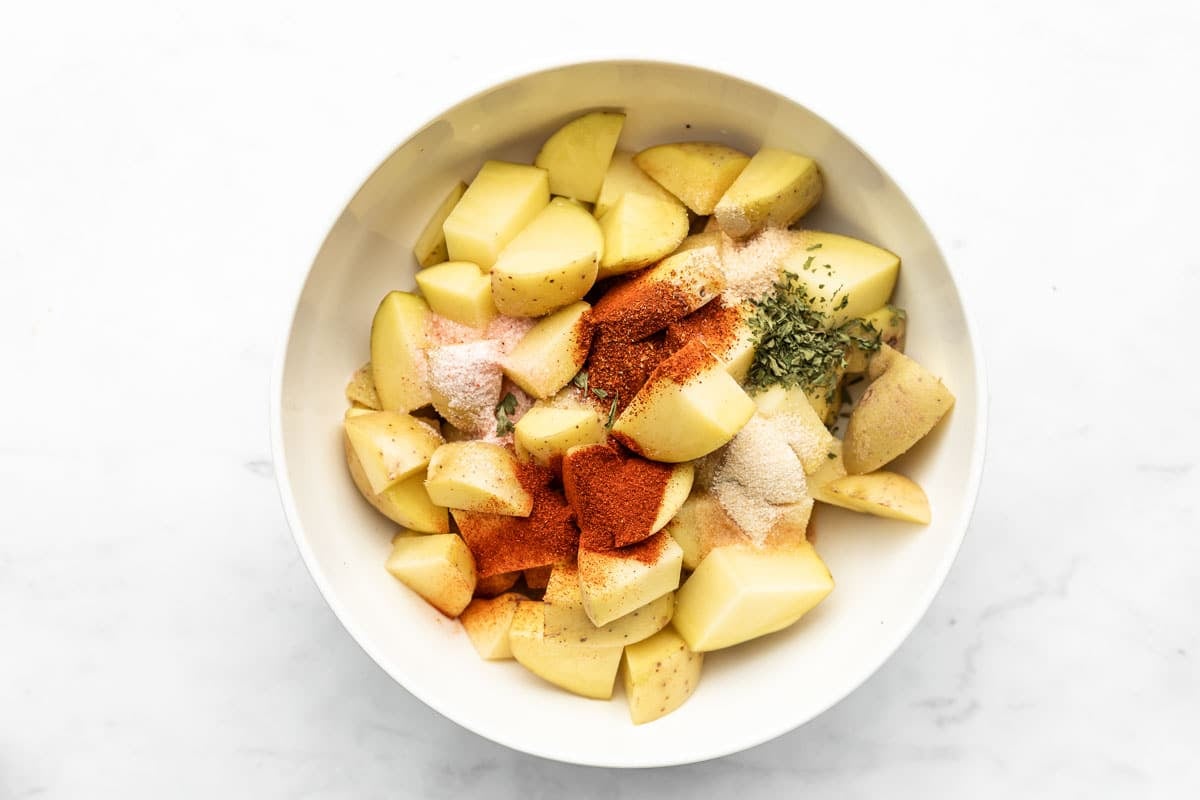 Cut potatoes and then add them to a bowl with your oil and seasonings. Stir or use your hands to fully coat the potato pieces.