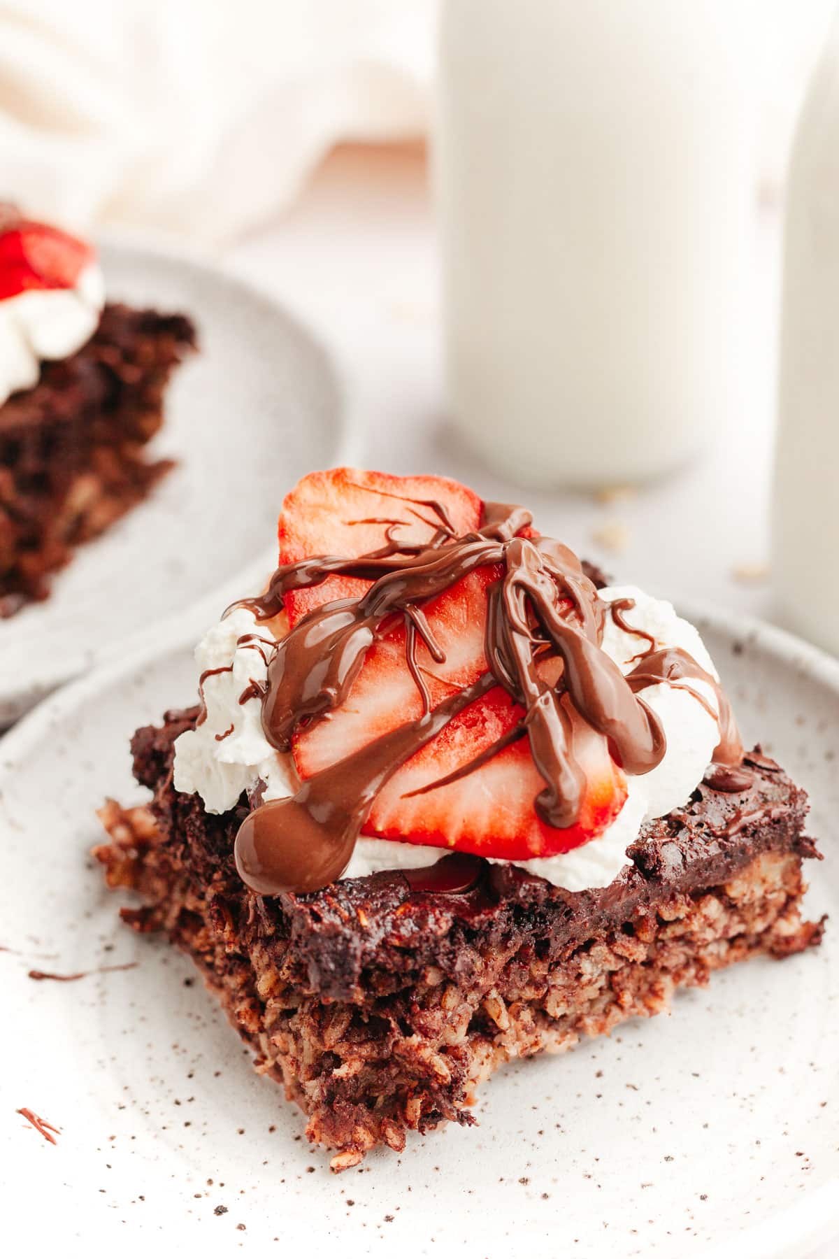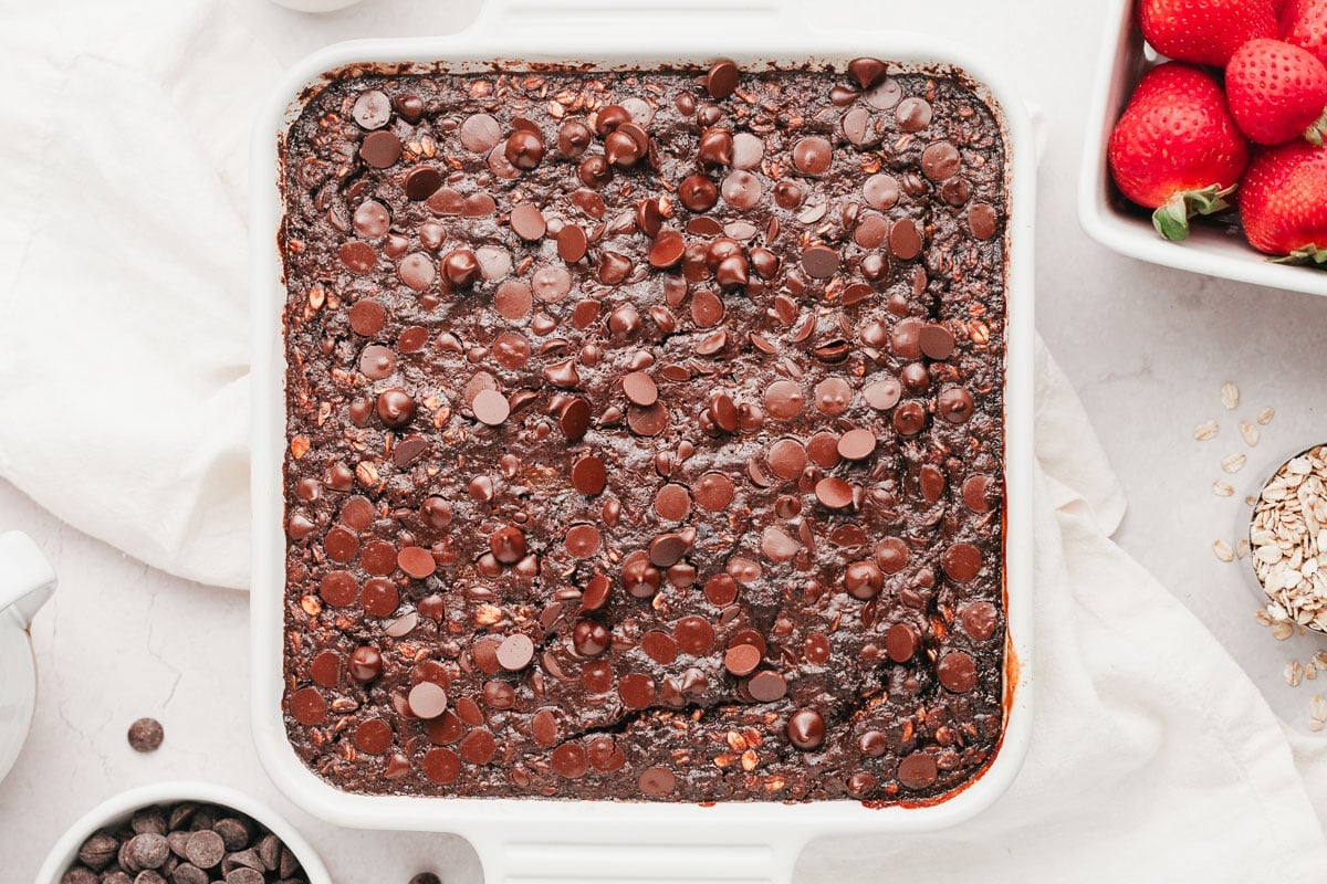 Chocolate Baked Oatmeal can be enjoyed right away but it’s also the ultimate make ahead breakfast! Reheat one slice at a time for a quick healthy meal to start your day all week.