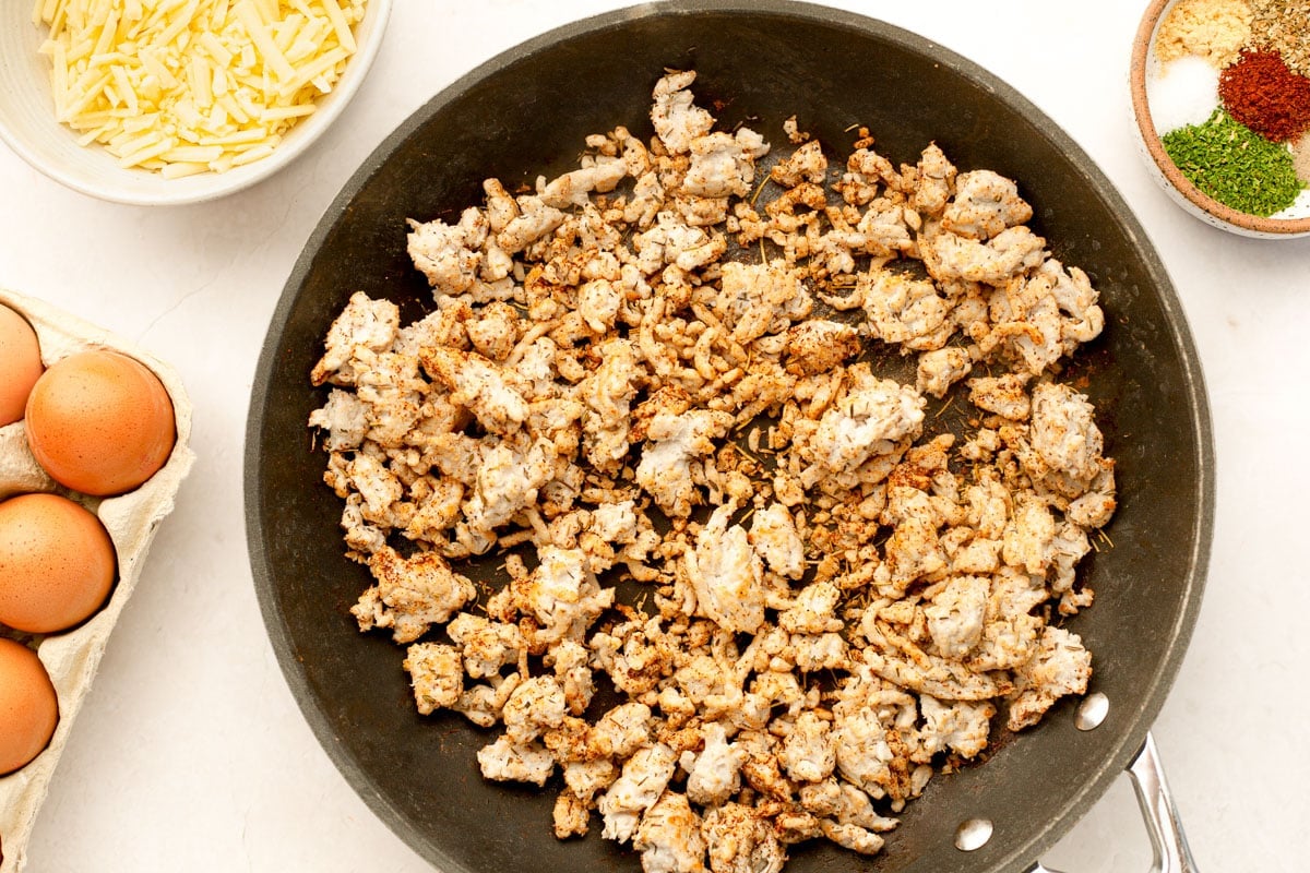 - Add your ground meat to a large skillet on the stovetop.ย Use a spatula to crumble the meat. Cook on medium-high heat, stirring occasionally, until browned. Stir in rosemary, thyme, salt, pepper, and chili powder.