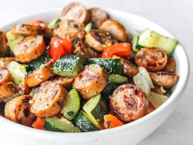 The #1 most visited recipe on my blog is this one! Throw together this quick skillet dinner when you need a healthy and satisfying meal in a hurry! Youโll love this perfectly seasoned mix of sausage, zucchini, peppers, and onions. Whole30 compliant, dairy free, gluten free โ and extra delicious!