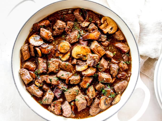 I am obsessed with these tender steak bites swimming in a savory mushroom gravy! I cannot rave about this incredible entree enough. Serve it over mashed potatoes for a meal that will make you oh so happy!