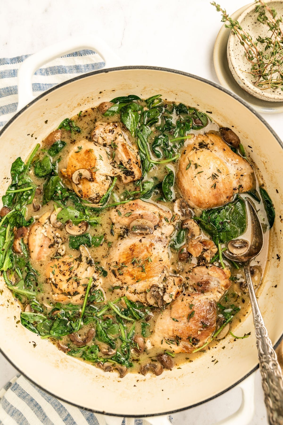 - Place chicken thighs back in pan and top with chopped fresh thyme.