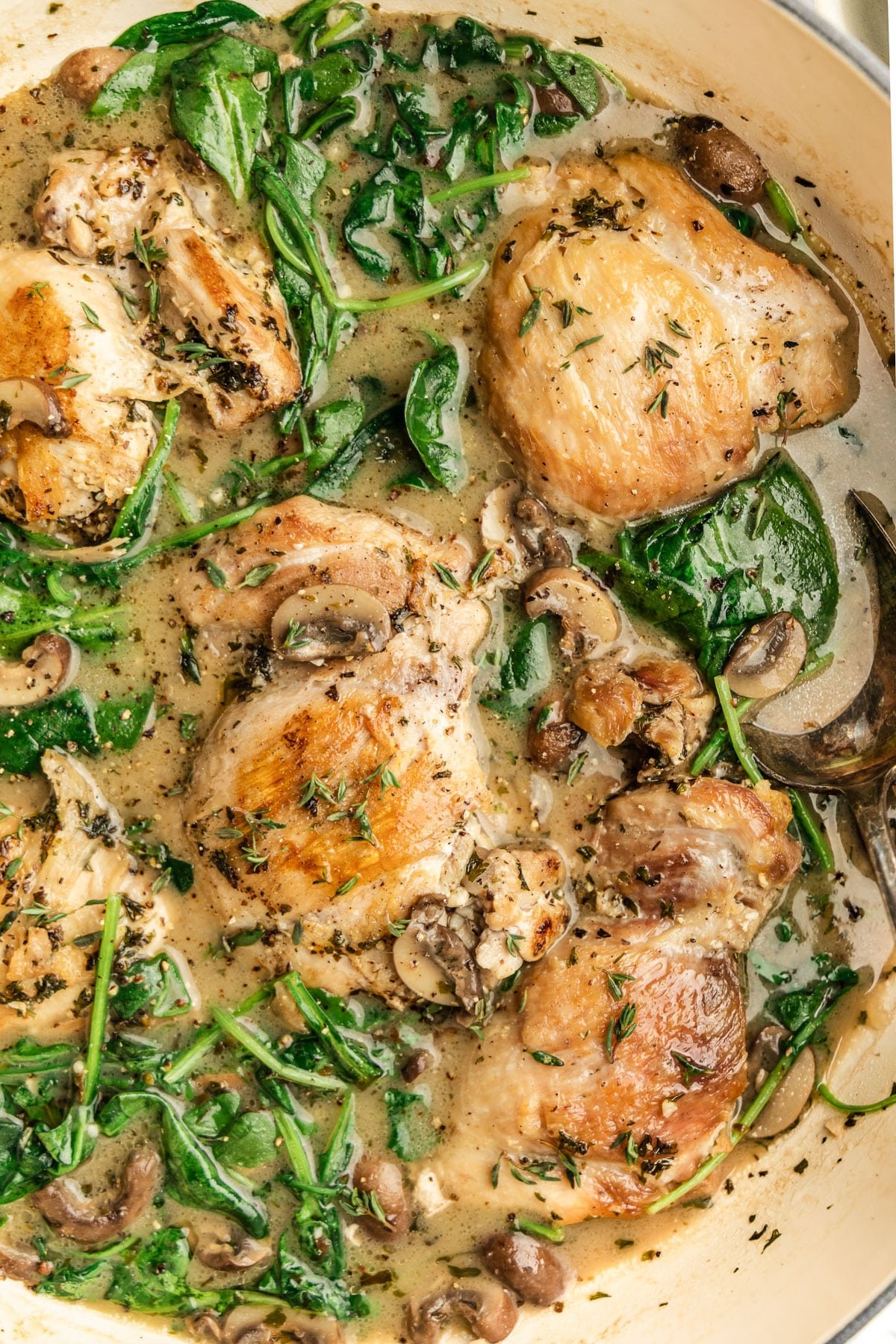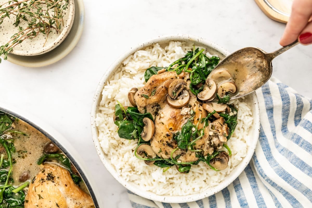 These chicken thighs simmer in a creamy mushroom sauce. Serve over white rice, cauliflower rice, or roasted potatoes.