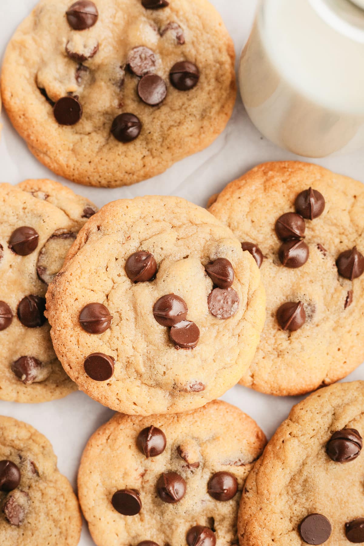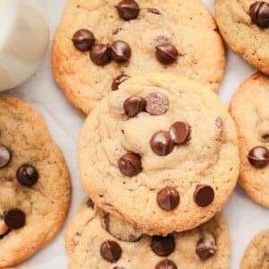 Each bite is chewy and loaded with chocolate. Soft, with a little crisp, and every bit as delicious as classic chocolate chip cookies you’ll find in any bakery. Good luck not eating the whole baking sheet of cookies, friend.