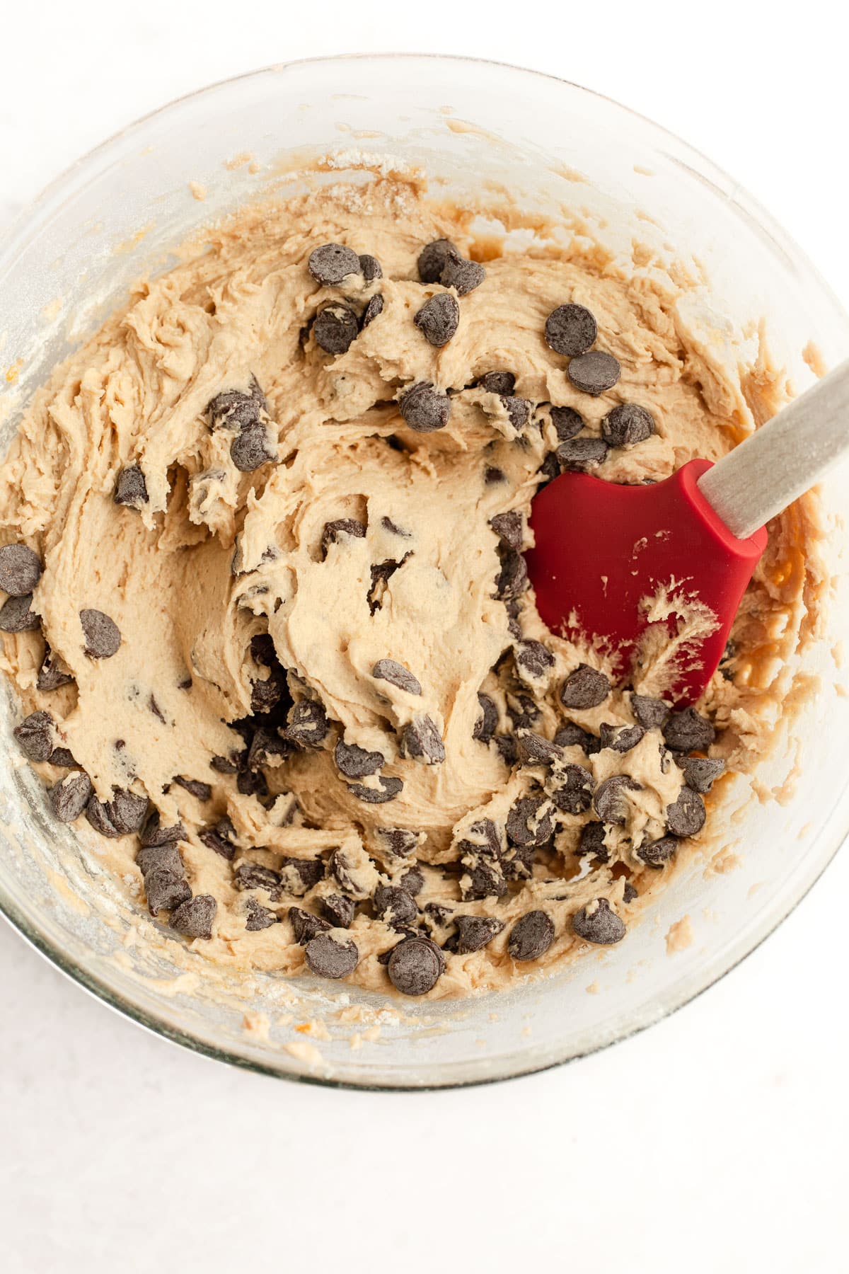 First beat the coconut oil and vegan butter in a large mixing bowl. Add granulated sugar, brown sugar, and baking soda. Beat until combined. Beat in eggs and vanilla. Slowly add the flour until well combined. Now stir in your chocolate chips.