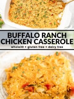 My Buffalo Ranch Chicken Casserole is super creamy and looks cheesy but there’s absolutely no cheese in it. In fact it’s dairy free and uses spaghetti squash instead of traditional spaghetti noodles. Have I blown your mind yet?