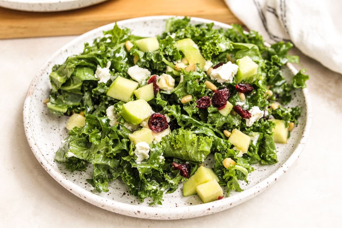 Having said that, you can definitely massage the kale in the recipe if you’d like! Simply add one teaspoon of the olive oil to the chopped kale before adding the other ingredients. Use your hands to gently scrunch the leaves until they’re a little softer. Then add in all other ingredients including the remaining olive oil.