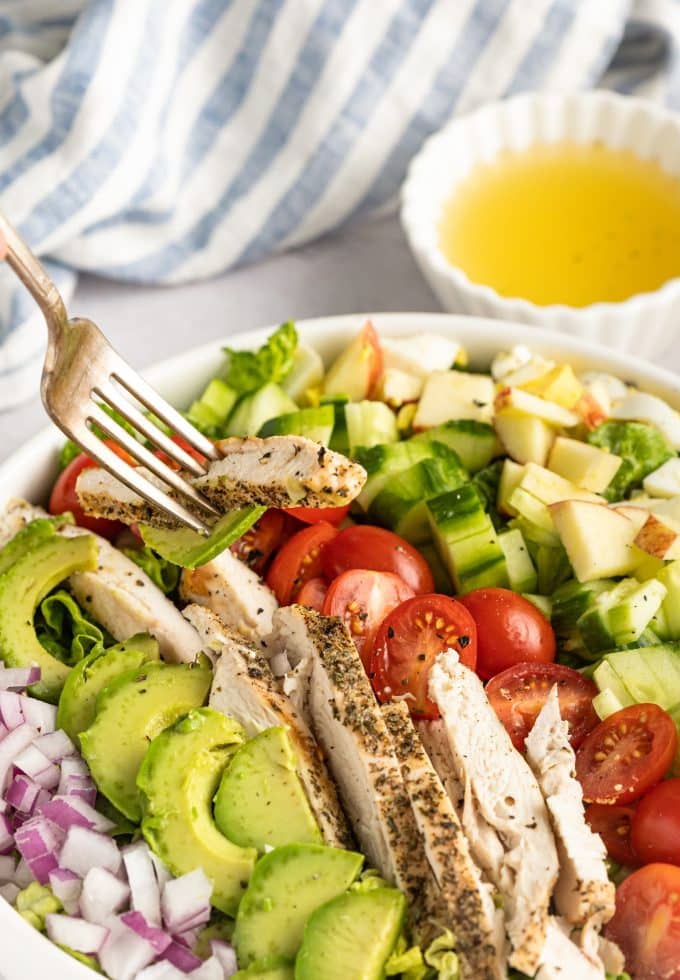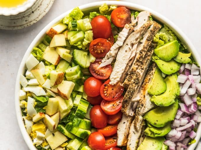 - To assemble the salads, divide your chopped lettuce into bowls. Top with tomatoes, apples, cucumber, hard boiled eggs, and red onion. Slice your chicken and add it to the salads. Add your sliced avocado at the very end to prevent browning.