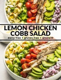 This Lemon Chicken Cobb Salad is loaded with apples, cucumbers, red onion, avocado, hard boiled eggs, chicken, and a super quick lemon vinaigrette!