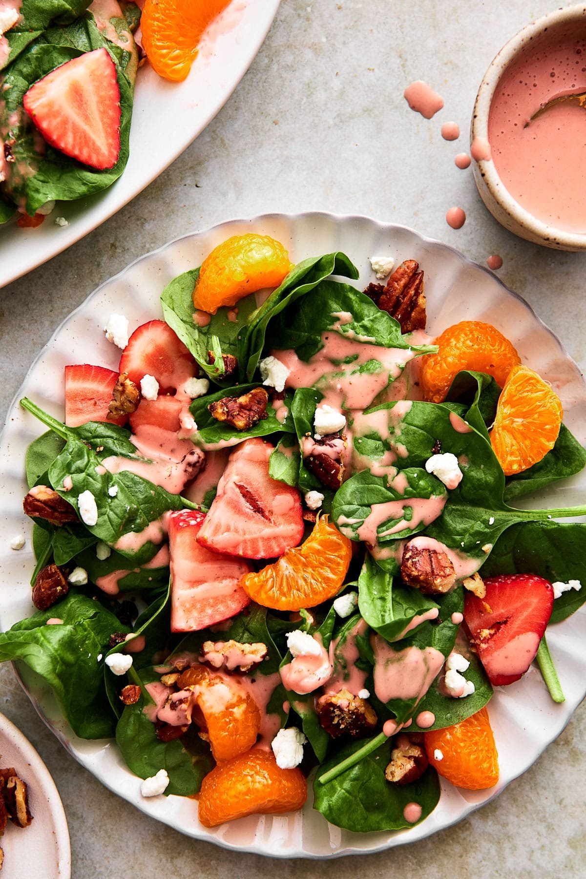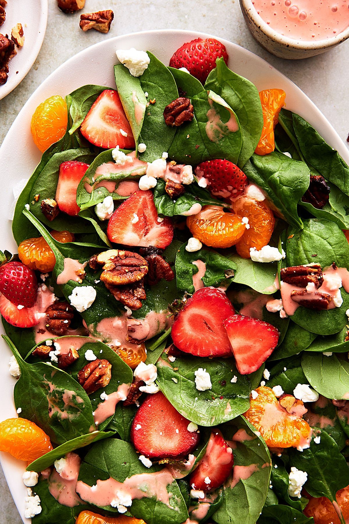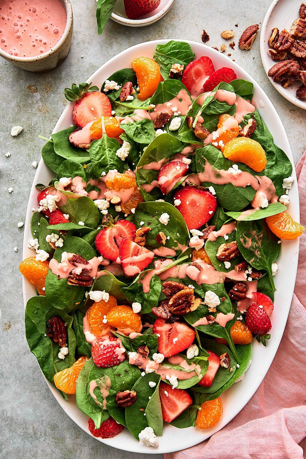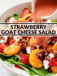 This spinach salad is loaded with fresh strawberries, mandarin oranges, goat cheese, candied pecans, and a homemade creamy strawberry dressing. It’s an incredible summery side salad or entree!