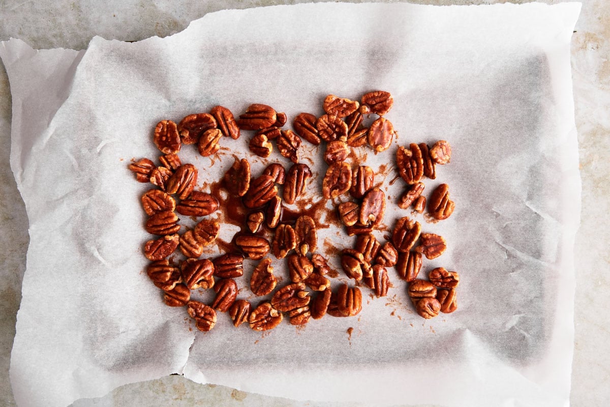 - Spread the coated pecans in a single layer on a parchment paper lined baking sheet.