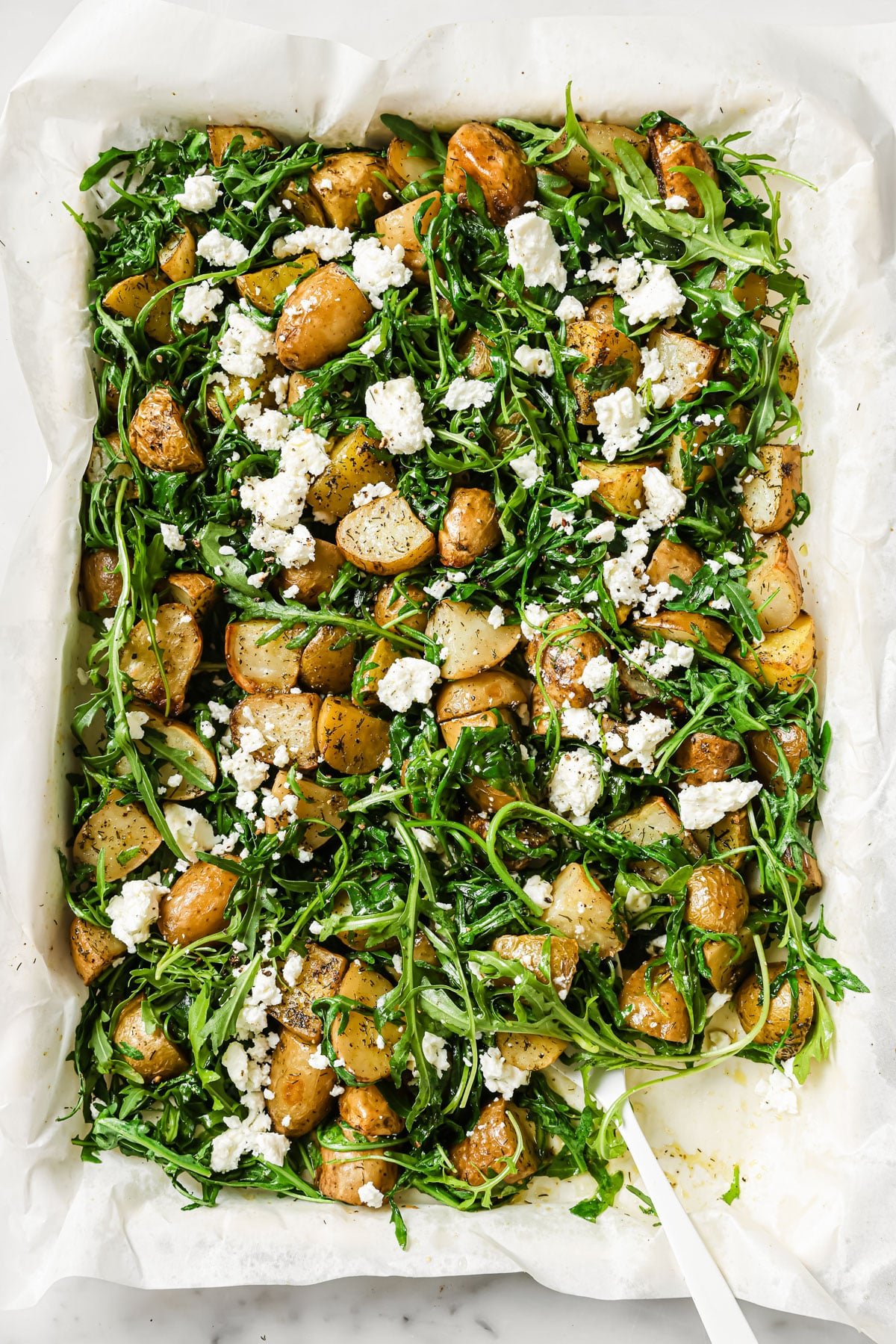 This warm salad of tender roasted potatoes, fresh arugula, and creamy feta is a deliciously simple side. It’s a comforting addition to any meal.
