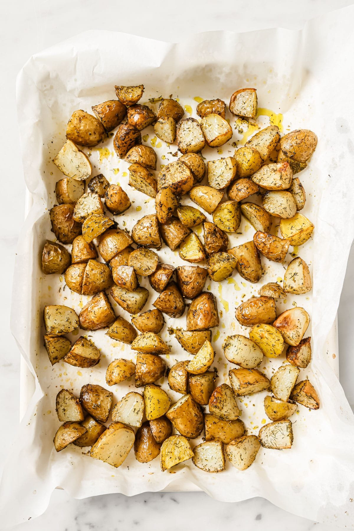 - Add the potato pieces to a baking sheet. Drizzle with oil. Sprinkle basil, dill, garlic powder, salt, and pepper. Use a spatula to move the potatoes around in the oil and seasonings so that all get coated evenly. Then spread the potatoes into a single layer.