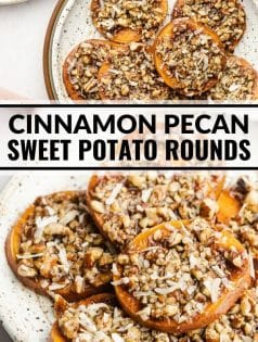 These baked sweet potato slices capture the rich flavor of a sweet potato casserole but they’re healthier and refined sugar free. Topped with an easy cinnamon pecan crumble!