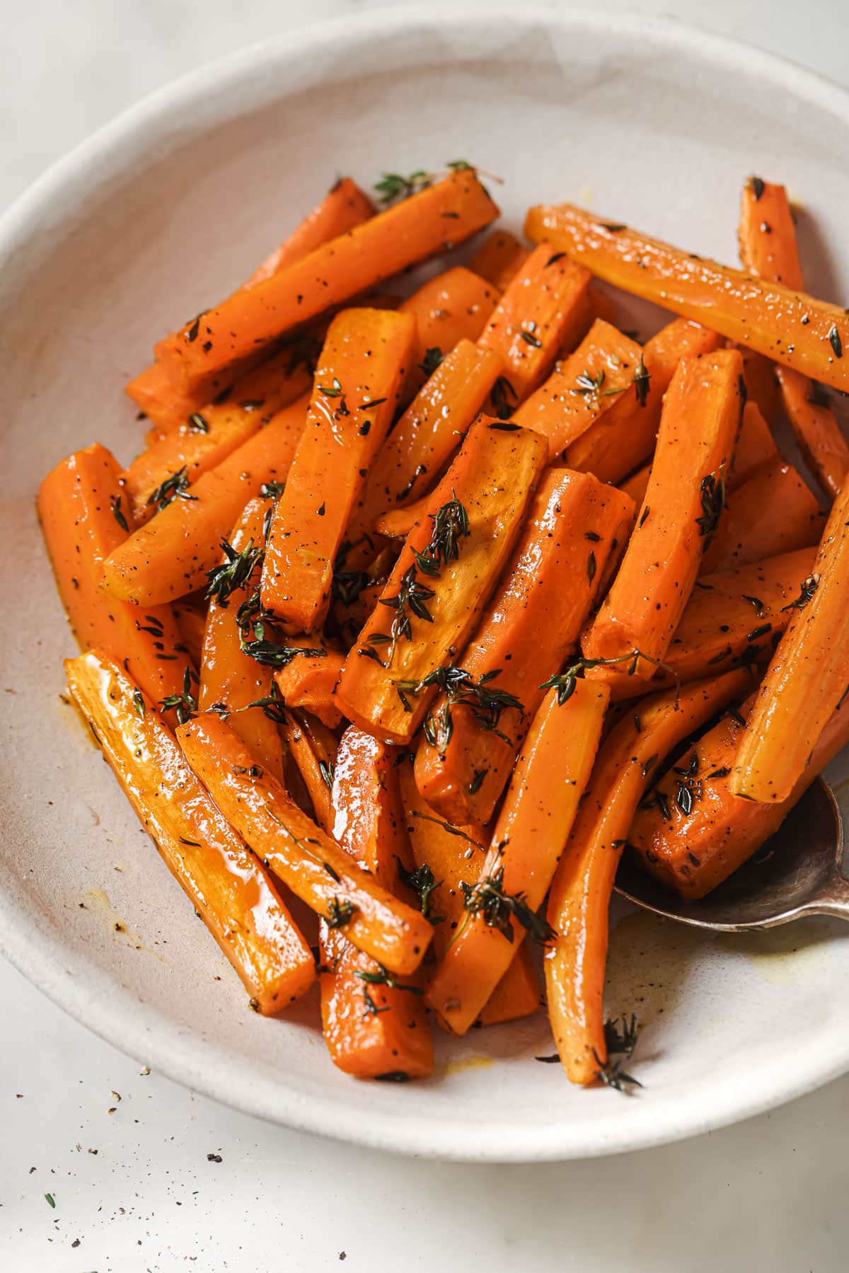 - Remove the leaves from your sprigs of thyme. To do this just hold each sprig at the top and gently slide your fingers down it to remove leaves. Sprinkle on top of your carrots. (I’m pretty generous with the thyme because the flavor is fairly mild.)