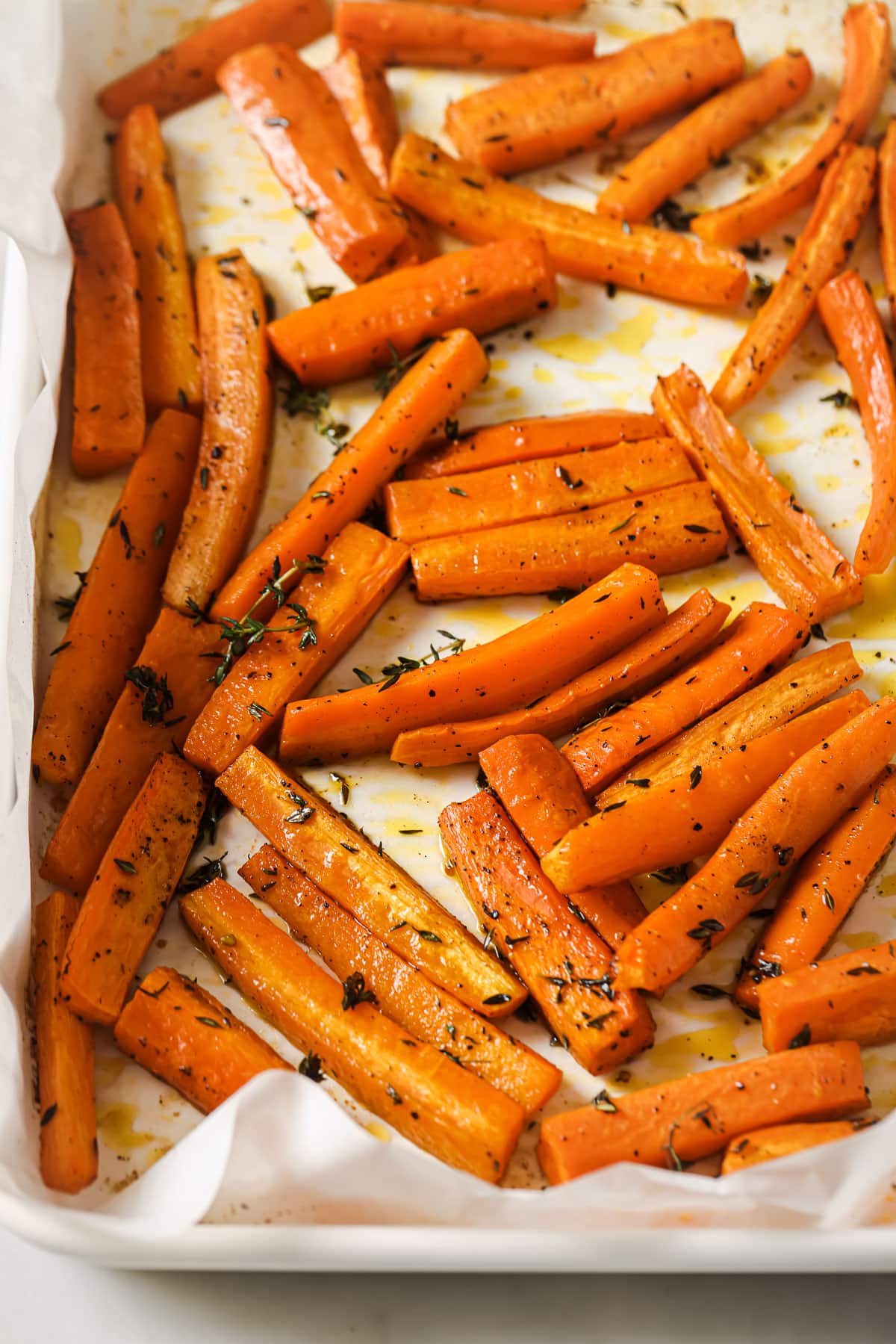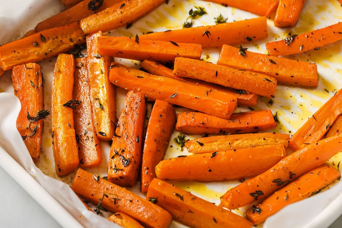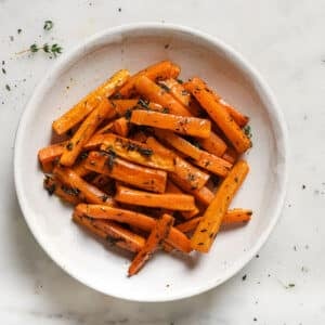 Lemon Thyme Roasted Carrots require a few simple ingredients like olive oil, fresh lemon juice, and thyme. Pop them in the oven. You’ll have perfectly tender carrots in less than 30 minutes.