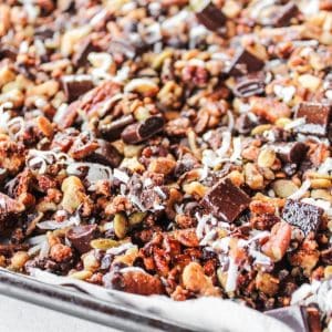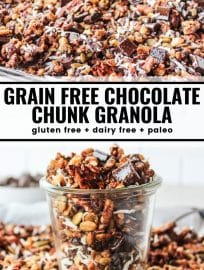 This grain free granola is crunchy and indulgent. It’s sweetened with maple syrup or honey and loaded with nuts, shredded coconut, and chocolate chunks for a delicious treat!