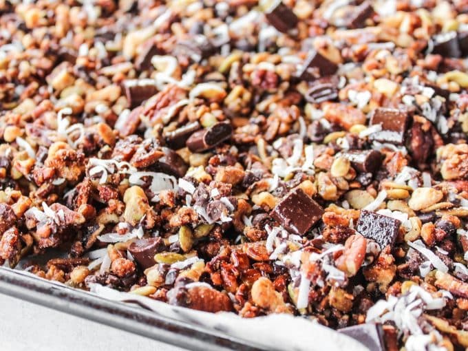 - In a small bowl, stir together the maple syrup or honey, coconut oil, and vanilla. Pour over the nut mixture and then use a spatula to stir it all together. You want everything evenly coated. Spread in an even layer.